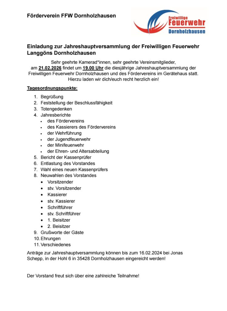Einladung zur Jahreshauptversammlung der Freiwilligen Feuerwehr Langgöns Dornholzhausen